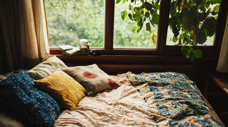 A serene bedroom featuring a comfortable bed adorned with colorful pillows and a cozy quilt, surrounded by natural light and greenery from large windows.