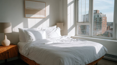 A bright and airy bedroom featuring white bedding, modern furniture, and large windows offering an urban view. Perfect for showcasing comfort and contemporary decor.