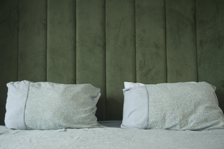 Create a cozy bedroom with a green headboard and twin pillows for a modern look