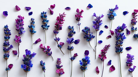 Flat lay design showcasing various shades of purple and blue flowers and petals arranged aesthetically on a white surface. The flowers are in different stages of blooming, exhibiting diverse forms and textures. The petals are scattered around the flowers in a visually appealing manner, creating a vibrant and decorative composition. The image emphasizes the intricate beauty of flowers and petals, showcasing their details against a simple white backdrop.