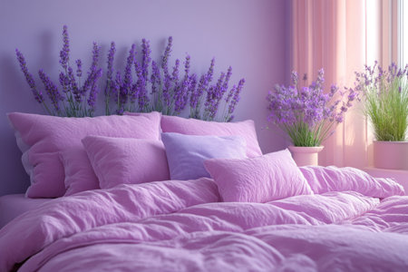 A beautiful arrangement of lavender flowers in a soft ceramic pot sits on a bed adorned with plush pillows and blankets, creating a serene atmosphere perfect for relaxation and tranquility.