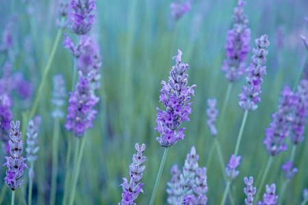 Lavender flower background. Violet lavender field sanset close up. Lavender flowers in pastel colors at blur background. Nature background with lavender in the field.
