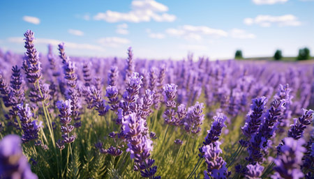 Vibrant purple lavender flowers stretch across the field, basking in bright sunlight with fluffy clouds above.