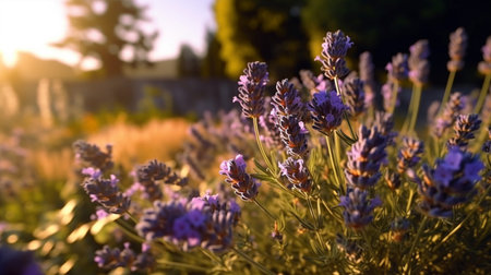Lavender flowers expand across the garden, their vivid purple hues illuminated by the golden sunset light, creating a peaceful atmosphere filled with soothing scents and colors.