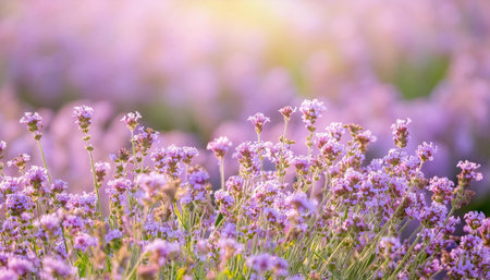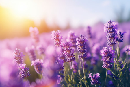 Golden sunlight bathes a vast field filled with delicate lavender flowers, their rich purple hues painting a tranquil landscape that enchants the senses and offers a soothing aroma.