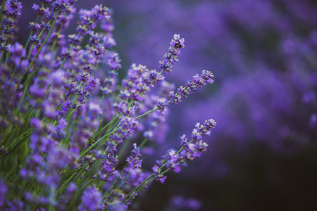 Lavender flower field closeup on sunset, fresh purple aromatic flowers for natural background. Design template for lifestyle illustration. Violet lavender field in Provence, France.