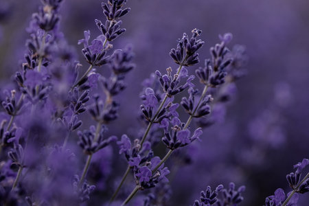 Close-up of lavender flowers with moody tones and bokeh effect in the background. Photo taken on July 17, 2020. Location: Sadali, Sardinia, Italy.