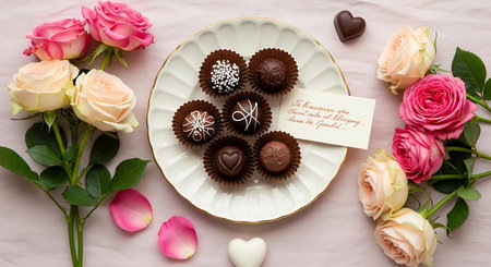 A plate of delicious chocolates surrounded by roses for a chinese lunar celebration