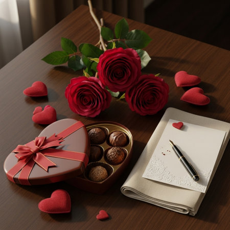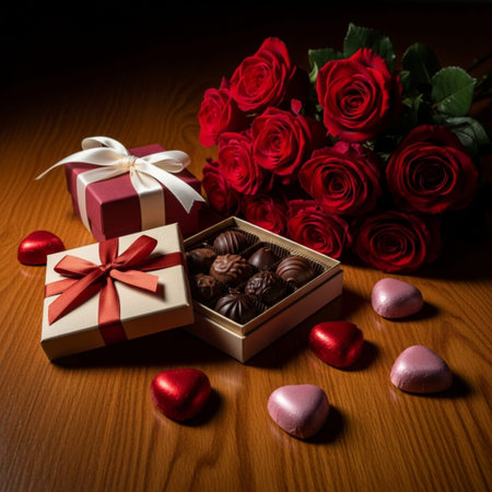 A perfect romantic scene featuring vibrant roses, heart-shaped chocolates, and soft candlelight ambiance by Generative Ai.