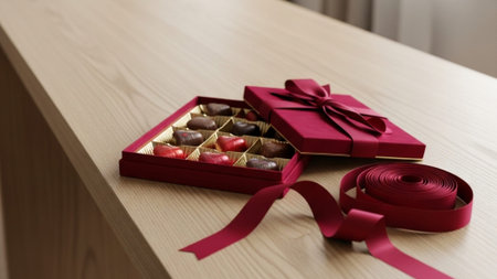 A flat lay of a Valentine chocolate box with chocolates spilling out, set on a soft velvet surface with heart-shaped accents and subtle lighting