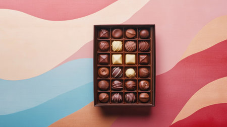 A beautifully arranged box of assorted chocolates sits on a vibrant and colorful background featuring wave patterns. Perfect for celebrations.