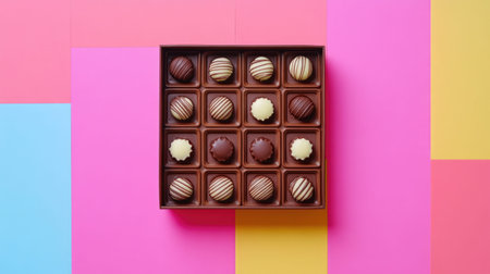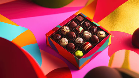 A visually striking assortment of chocolates displayed in a colorful box against a vibrant, abstract background, ideal for conveying indulgence and celebration.