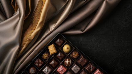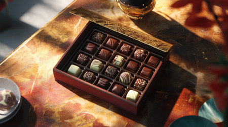 An elegant box of assorted chocolates featuring various styles and textures, artistically arranged on a vibrant table surface, perfect for gifts.