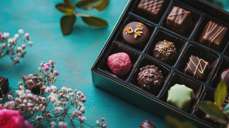 An elegant assortment of handmade chocolates arranged in a sleek box, surrounded by delicate flowers on a vibrant green background, perfect for any special occasion.
