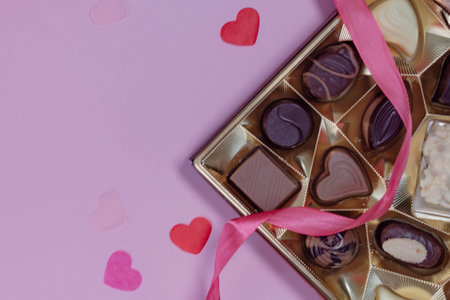 A box of heart-shaped chocolates tied with a pink satin ribbon, displayed on a white backdrop