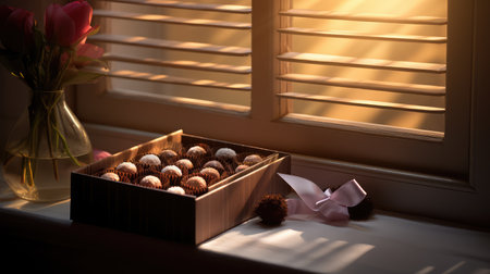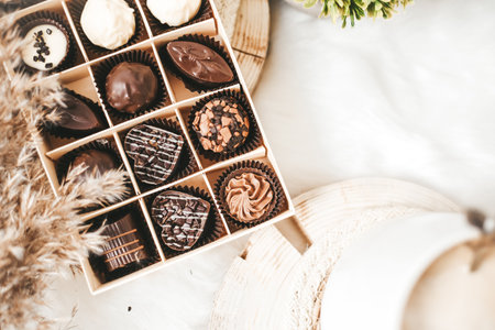 A charming assortment of exquisite chocolates arranged in a stylish box, perfect for gifting on special occasions or enhancing home decor with sweetness.