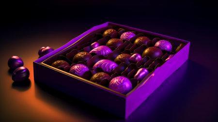 Box of purple and gold chocolates on dark surface with purple background. Generative AI.