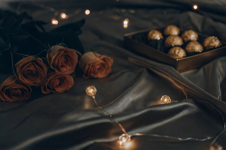 A bouquet of roses sits next to a box of chocolates on a silk fabric with fairy lights.