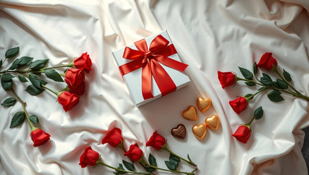 A realistic image of a Valentine's Day gift box, with chocolates, a love note and rose petals, arranged on a white tablecloth adorned with heart-shaped confetti for a festive touch