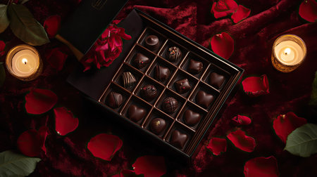 A Valentine chocolate gift box with assorted chocolate pralines, surrounded by red rose petals and candlelight, set on a soft velvet surface