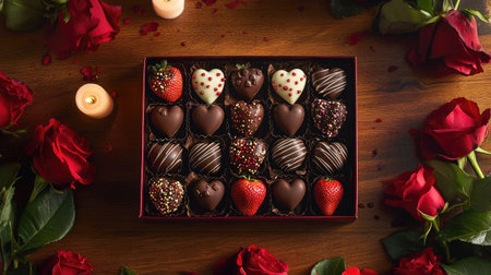 A box of Valentine chocolate strawberries, beautifully arranged with various chocolate coatings, set on a wooden table surrounded by red roses and soft candlelight