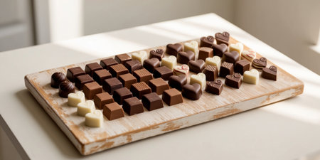 AI Generated. Assorted chocolate squares and hearts on a wooden platter for delicious dessert presentation