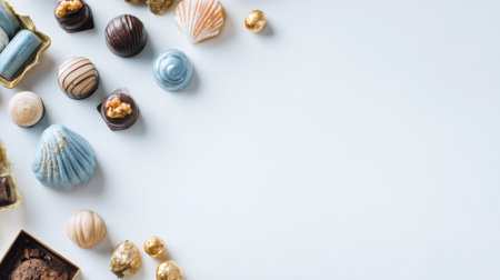 A beautiful arrangement of assorted chocolates and confections showcases a delightful selection of sweets against a light blue background, perfect for dessert lovers.