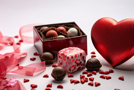 A delightful arrangement of heart-shaped chocolates surrounded by vibrant red roses and playful confetti, perfect for celebrating love and special occasions.
