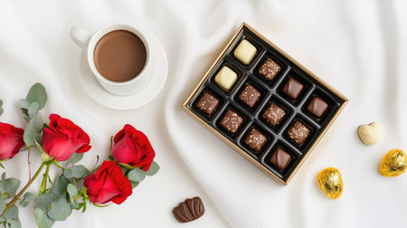 An enticing arrangement featuring a box of assorted chocolates paired with a cup of coffee and fresh red roses, perfect for romance and special occasions.