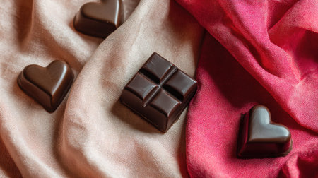 A delectable arrangement of heart and square-shaped chocolates on soft fabric, perfect for romantic moments or gourmet desserts to delight any occasion.