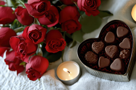 Heartwarming arrangement of roses, chocolates, and a glowing candle, creating a romantic atmosphere by Generative Ai
