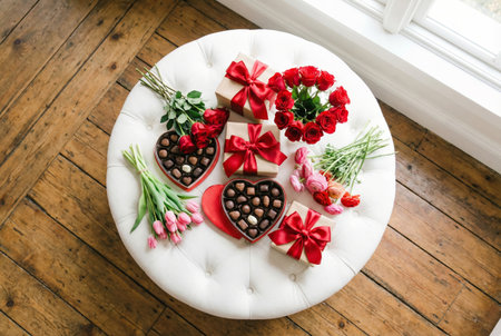 Valentine gifts arrangement with heart-shaped chocolate boxes red roses tulips and wrapped presents on white tufted ottoman