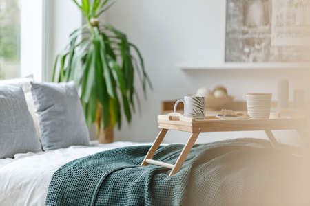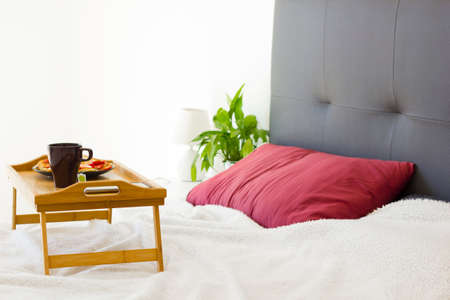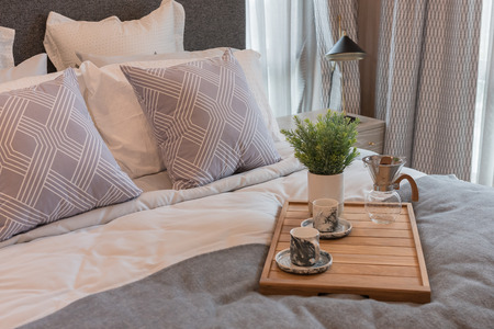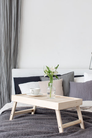 Bedroom grey interior with small table on bed with mug of coffee on it.