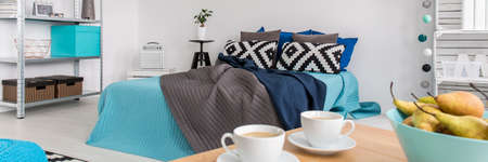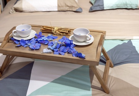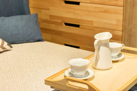 wooden tea table stands on the bed with cups. Bed with pillows and blue duvet and wooden chest of drawers