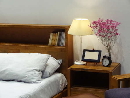 interior design of cozy bedroom with flowers decorate on side bedroom table