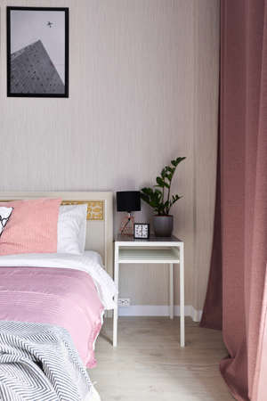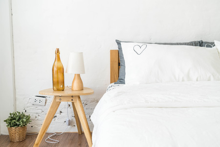 cozy bedroom detail with focus on white wooden tabletop
