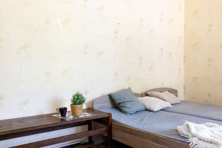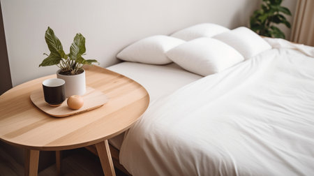 Home bedroom interior, white bed decor. Cozy room with scandinavian design, closeup at coffee table near white bed. Furniture for comfortable relaxation, apartment with wooden object.