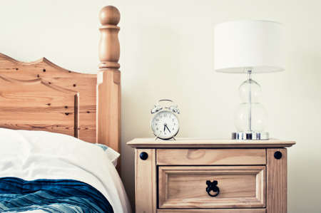 Stylish lamp and alarm clock on bedside table indoors. bedroom interior elements