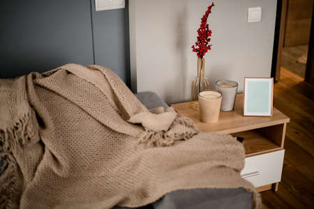 Romantic morning. Wooden coffee table with flowers on bed with plaid, coffee cup, flowers and candles, note pad, pen. Lilac roses with eucalyptus and anemones. Interior gray tones. High quality photo