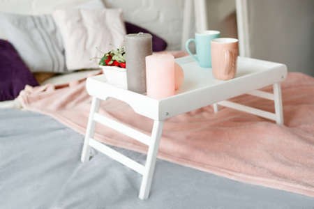 Breakfast in bed. Modern bedroom in pastel colors. Coffee and strawberries on small table decorated candles. Romantic concept and tendance between couples, close up side view