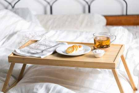 Yellow cottage cheese pancakes on the bed tray table with black tea and sour cream and napkin in the morning