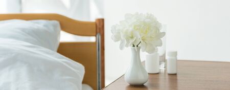 panoramic shot of vase with flowers and bottles with pills in bedroom