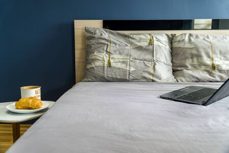 Working from home setup. Computer and breakfast in bed with croissant and coffee