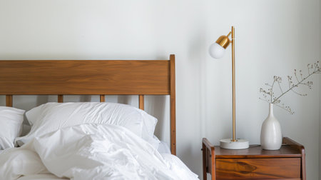 This image showcases a wooden bed featuring crisp white pillows, alongside a matching wooden bedside table. The scene is illuminated by soft, natural light, creating a warm, inviting atmosphere. The composition emphasizes the textures of the wood and linen, which could be suitable for interior design projects or lifestyle publications.