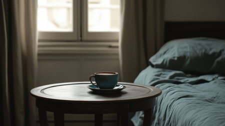 A serene morning moment with a coffee cup on a small round table, warm light filling the cozy space.