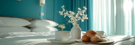 Luxurious breakfast on a bed in a hotel room on a sunny morning with copy space for text placement