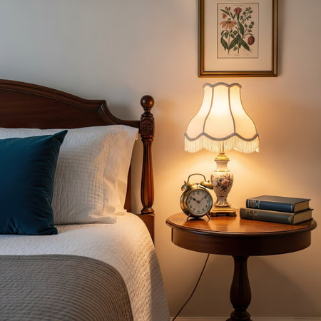 An inviting bedroom scene features a classic lamp illuminating a bedside table. A vintage clock and stacked books rest beside the lamp. Soft light creates a warm ambiance against the neutral tones of the wall and bedding. Suitable for various editorial and commercial applications.