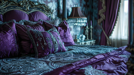 A stunning four-poster bed, adorned with elegant silk pillows and royal purple and silver satin linens, sits in the center of a lavishly decorated bedroom The ornate crystal bedside lamp adds a touch