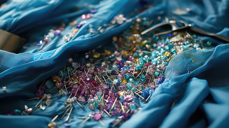 A vibrant collection of colorful beads and pins displayed on a textured blue fabric surface, perfect for crafting enthusiasts and artistic projects.