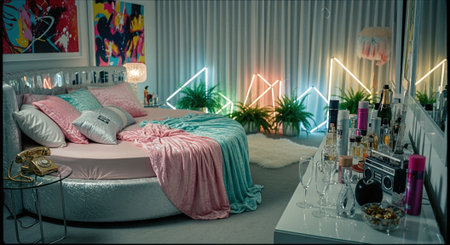 A stylish bedroom featuring a round bed with pink and turquoise bedding, decorative pillows, neon lights, plants, and a mirrored dresser with various bottles and decor